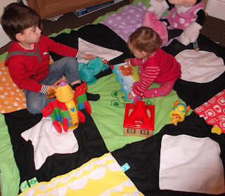 The PlayDuvet is essentially designed as a double duvet cover so you just pop it on a spare double duvet, zip it up (the zip is hidden underneath away from curious hands) and .. Tada! You have a giant playmat that is not only lovely and padded to protect little ones from cold hard floors but is also covered with giant colourful squares which provide a selection of sensory play!