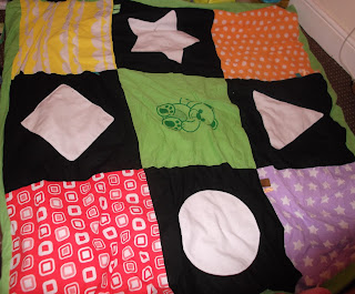 | The squares are made from different textured fabrics and there are a variety of bright coloured patterns and bold black and white shapes to capture even the youngest baby’s interest! |