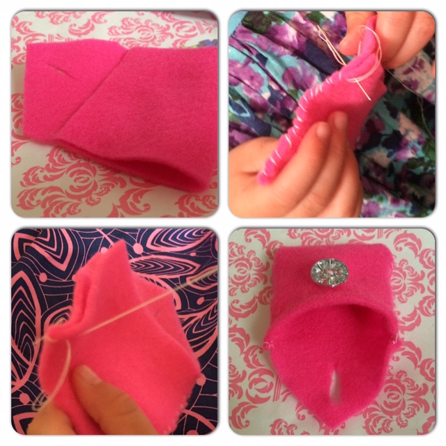 I cut a really simple purse shape out of a piece of pin felt and threaded a needle. Folding the felt down and holding the edges together I made a few blanket stitches while Elizabeth watched, she was eager to take over and copied me easily sewing along the edge until she got close to the end where I knotted it off for her. I then started her off on the other side where again she continued until she was close to the end and I tied it off, I popped a few invisible stitches in the top and then popped on a very sparkly button that Elizabeth chosen from my button box.